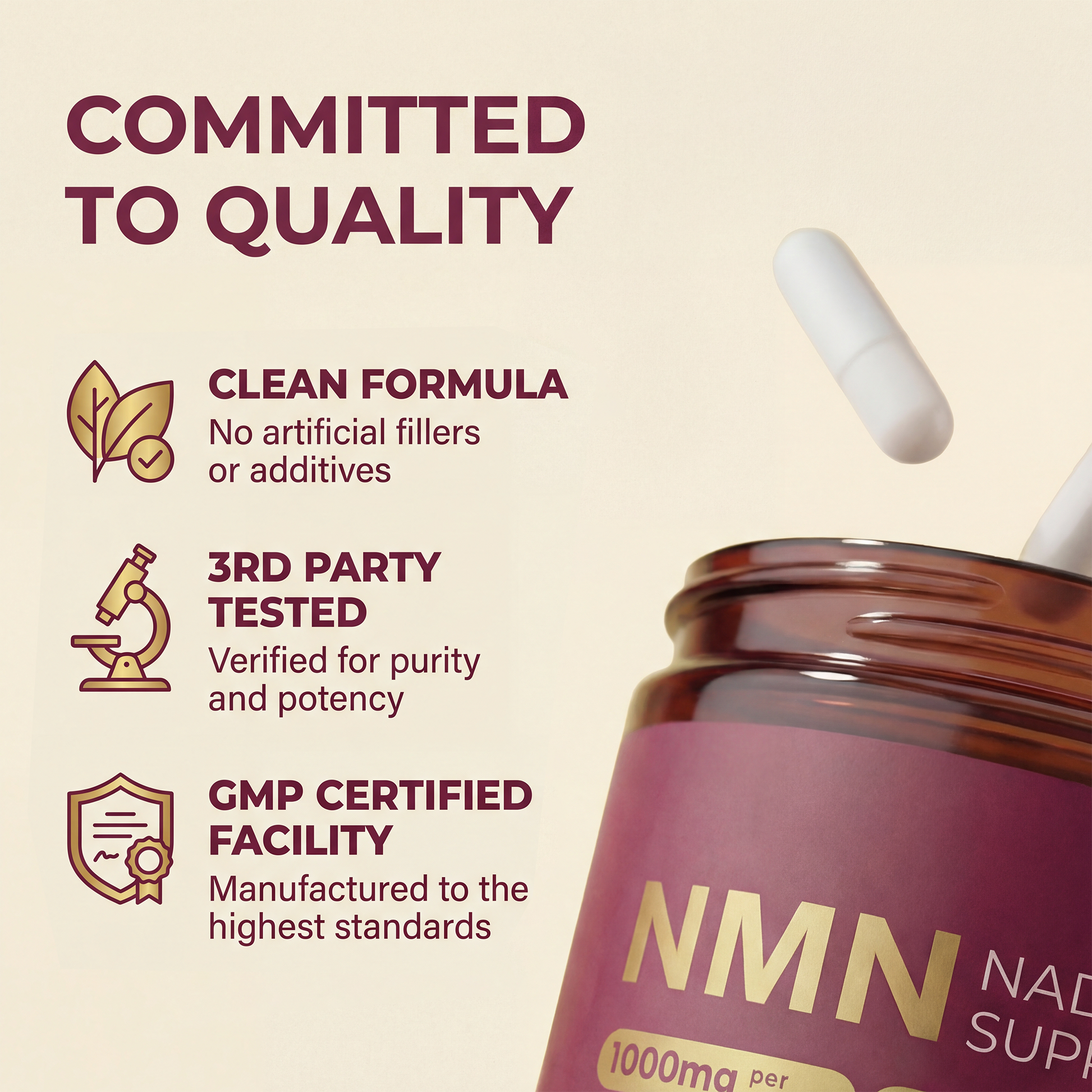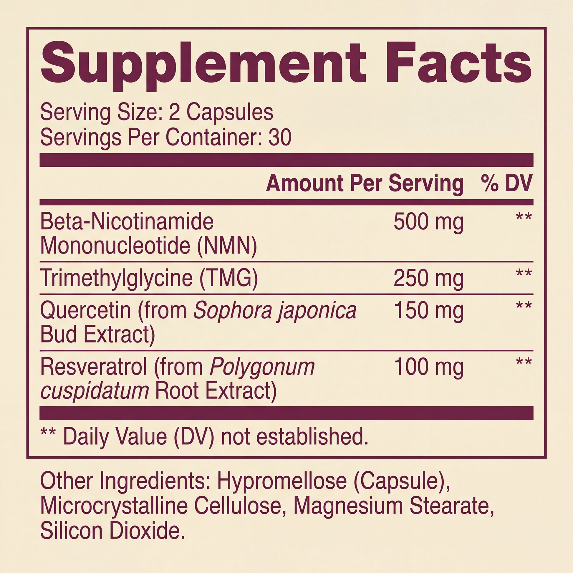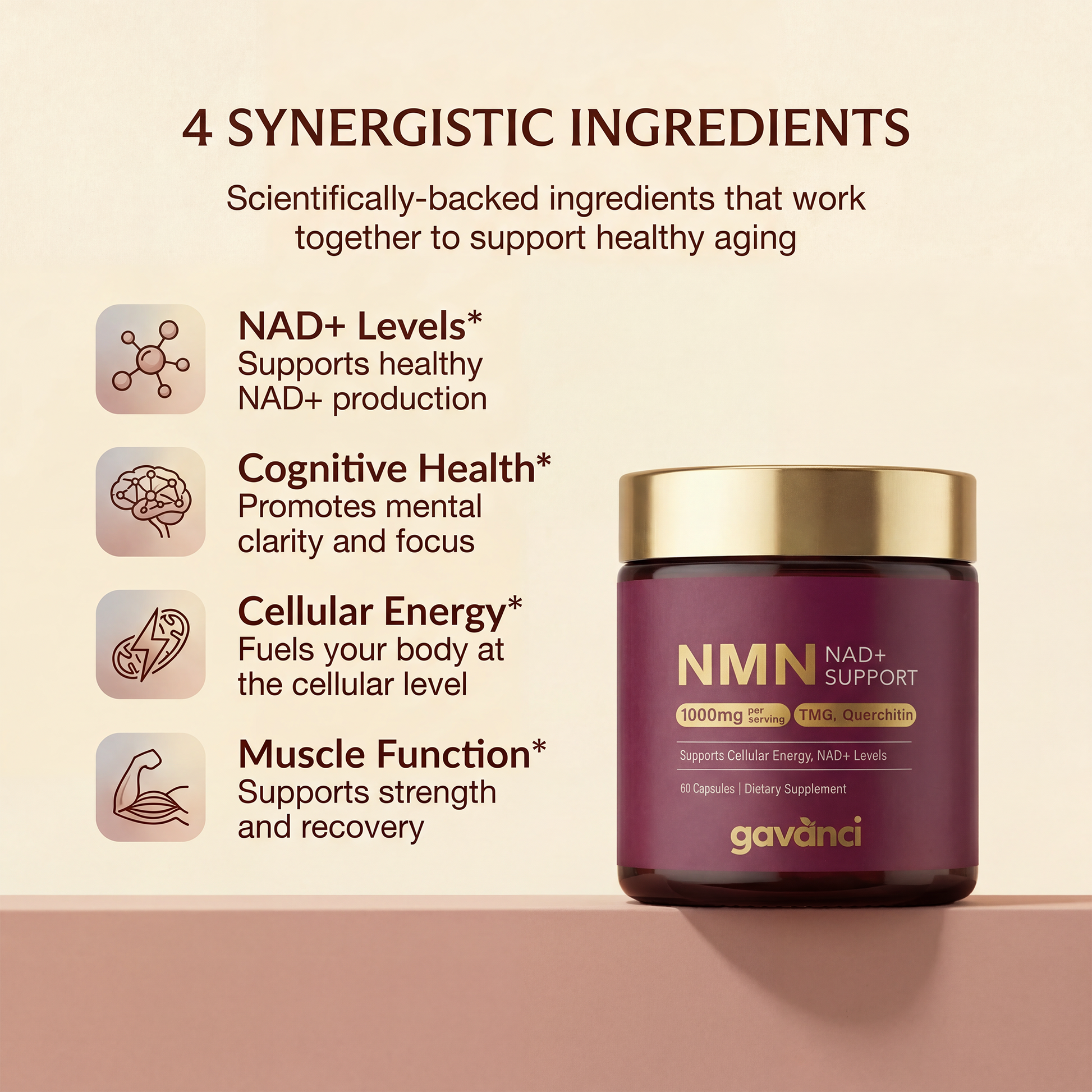 Most NMN products are just NMN on its own, which your body has to process without additional support. Our formula includes TMG for methylation support, quercetin for cellular protection, and resveratrol to enhance absorption, so everything works together the way your body actually needs it to.