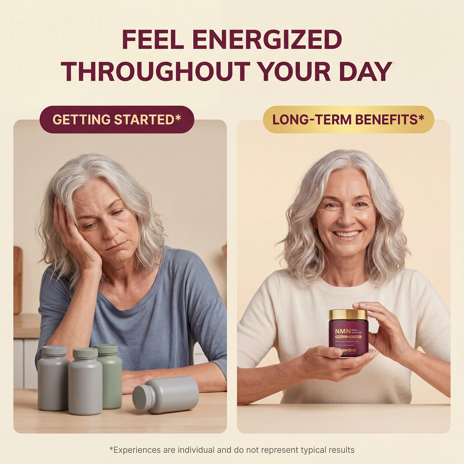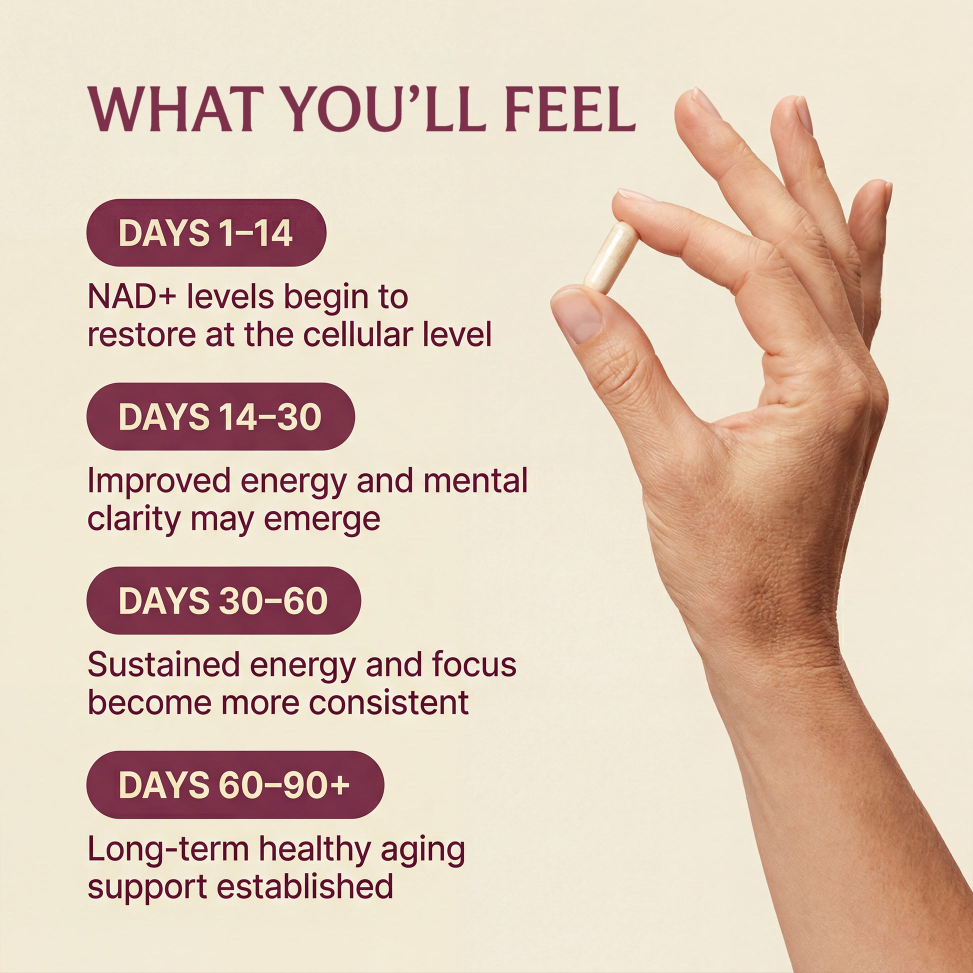 Some women feel a shift in energy within the first week, but the real transformation usually happens around week three when your NAD+ levels have had time to rebuild consistently. This isn't an overnight fix, it's a gradual restoration of what your body's been missing.